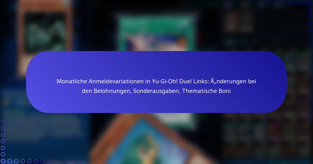 Monatliche Login-Variationen in Yu-Gi-Oh! Duel Links spiegeln Änderungen in den Belohnungen, dem Spielerengagement und den thematischen Boni wider. Diese Variationen können die Spielerbindung und die allgemeine Zufriedenheit erheblich beeinflussen, weshalb es wichtig ist, sie regelmäßig zu analysieren.